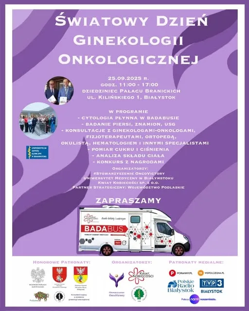 Zapraszamy już dziś 25 września (czwartek) na dziedziniec Pałacu Branickich odbędą się obchody Światowego Dnia Ginekologii Onkologicznej. Mieszkanki regionu będą mogły bezpłatnie skorzystać z badań profilaktycznych i konsultacji medycznych m.in. u lekarzy, fizjoterapeutów i ratowników z Uniwersyteckiego Szpitala Klinicznego w Białymstoku.